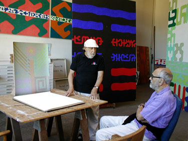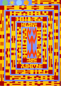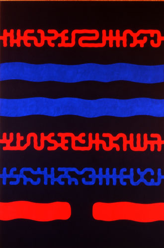 This painting illustrates the textile-like format that characterizes many in the series, but it conveys a vitality that is difficult to equal within the constraints of the loom technique.