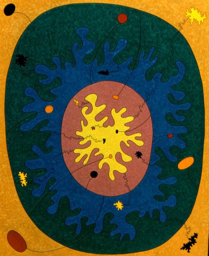 The few surviving works from the Paris years are experimental in the sense that they represent a search for an authentic vehicle for the artist’s convictions and are quite different one from another in both structure and color, as revealed by photographs of the installation of his first exhibition, in May, 1951, at the gallery of Cahiers d’Art, a journal edited by the critic Christian Zervos. Zervos was a major figure in the Parisian art world of this time; his enthusiastic support of Jesse’s work not only attested to its originality and quality but gave the artist’s career a momentum that must have influenced his reception on his return to the United States. The paintings in the Galerie des Cahiers d’Art show were all relatively small, as is usual in the work of young artists working in limited space on meager budgets. The most distinctive of them are those which, like 25 October 1950, are suggestive of microscopic, amoeba-like, biological forms that are connected by thin, sometimes nervously meandering lines.[2]