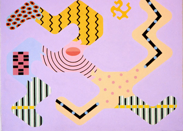 Most of the paintings retain the flat figures laid on a uniform ground that Jesse had employed in the earlier series, and many have the kind of underlying grid characteristic of works since the seventies. The variety of figure types is markedly increased, and the color scheme is rich in unfamiliar, subtle, mostly pale hues and excludes primary colors. Both the forms and the colors are uncommonly varied and lively—quite removed from the asceticism of the e.g. and I Ching paintings.