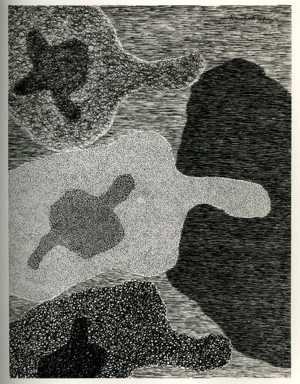 There is an intense, obsessive attack on the paper, every stroke being so deliberately placed that no inconsistencies are allowed. Any misstep would have caused the abandonment of the sheet and a fresh start on a blank one. The drawn image in this collection is always a fragment of a greater whole. While its component figures are fixed in place and interact with one or more others within the frame, most of the shapes seem to continue outside the borders of the sheet, and only occasionally the edges of one or two near the middle of the drawing have been completed within the frame. Each drawing, thus, becomes a microcosm of an infinity. Dessins may be read as a metaphor of matter and void in the universe.