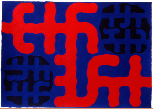 At first, the painting appears to present the orange/red figure and two black ones layered over a blue ground. But an ambiguity appears on closer inspection: within the black quasi-circles, the “lettering” of the inscription-like bands is made up of the blue of the ground, so that within the figure the black forms become the ground.